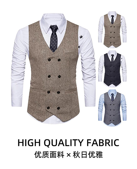 一般適合于復古穿搭中,在現實中并不常見。相對于單排扣,雙排扣無駁頭的款式會更正式、更嚴謹,尤其是搭配禮服時深受紳士們的喜愛。這個款式的馬甲讓你看上去尤其的有品位,而且它的百搭性也很強。